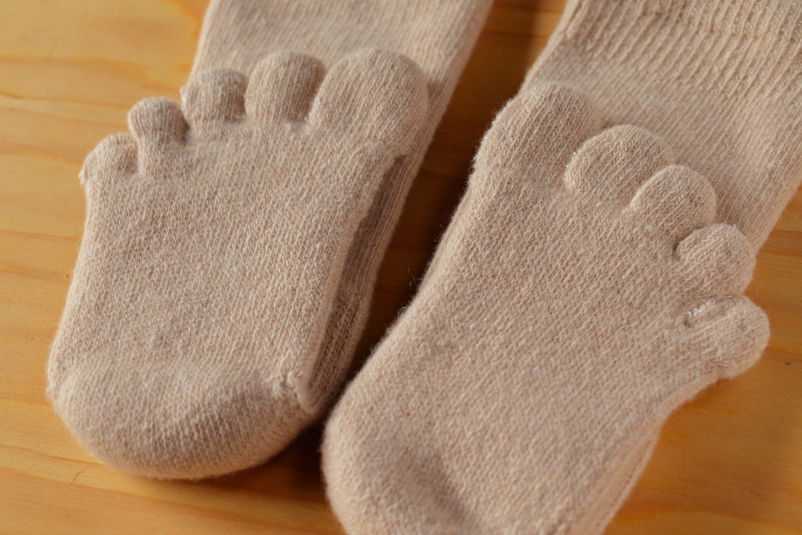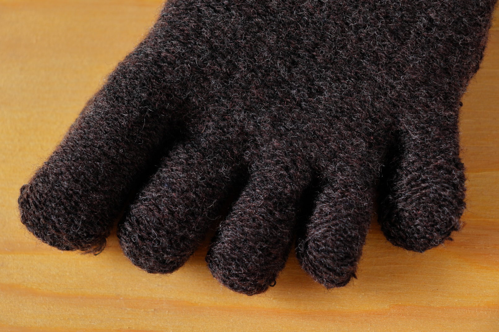 These are Gohon-yubi wool socks in the shape of a foot, using a three-dimensional knitting technique with WHOLEGARMENT. The entire sock is made of thick fabric to provide maximum warmth. In addition, since no elastic is used, there is no tightness at all.